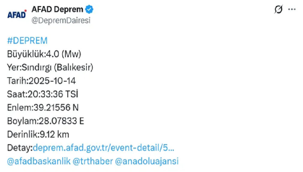 AFAD, depremin yerin 9.12 kilometre derinliğinde gerçekleştiğini açıkladı. Deprem nedeniyle vatandaşlar kısa süreli panik yaşadı.