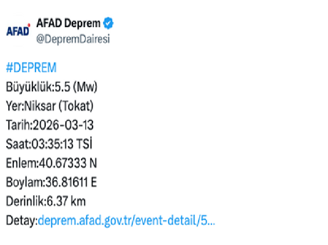 Tokat'ın Niksar ilçesinde 5.5 büyüklüğünde deprem meydana geldi. İçişleri Bakanı Mustafa Çiftçi, AFAD ve Tokat Valiliği an itibarıyla olumsuz bir durum bildirilmediğini duyurdu. Afet ve Acil Durum Yönetimi Başkanlığı (AFAD) Deprem Dairesi'nin verilerine göre saat 03.35'te Tokat'ın Niksar ilçesinde 5.5 büyüklüğünde deprem oldu. Depremin derinliği 6.37 kilometre olarak kaydedildi. Amasya, Samsun, Sivas ve Ordu'dan da hissedilen depremin merkez üssünün Niksar ile Erbaa arasındaki Pınarbeyli köyü olduğu açıklandı.