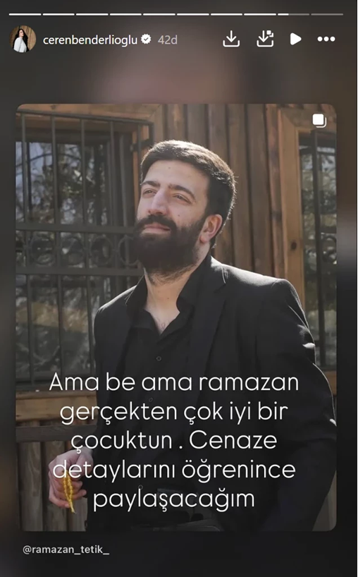 Oyuncu Çiğdem Tunç, sosyal medya hesabı Instagram'dan yaptığı paylaşımda "Ramazan'ı kaybettik... Tanıdığım en efendi,en sevgi dolu,en yetenekli genç oyunculardan birisiydi... Provalarını aksatmaz,geçimi için kuryelik yapardı...Hepimizin çok sevdiği bir genç insan ebediyete intikal etti biraz önce..Başımız sağalsın,Allah rahmet eylesin..Sabır diliyorum tüm ailesine ve sevenlerine...Çok üzgünüz..." ifadelerini kullandı.