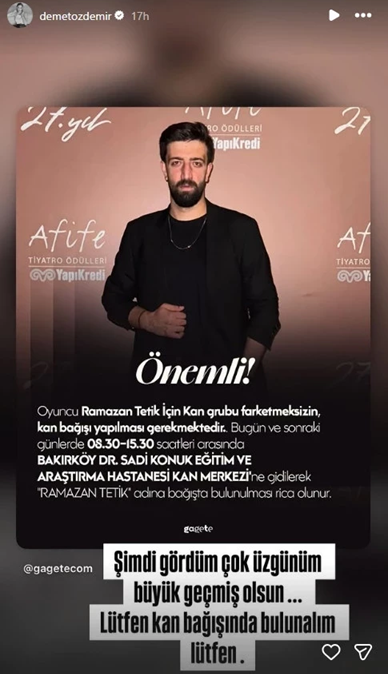 Ünlü oyuncu Demet Özdemir de çağrıya kayıtsız kalmamıştı. Sosyal medya hesabından paylaşım yapan Özdemir, “Çok üzgünüm, büyük geçmiş olsun. Lütfen k.an bağışında bulunalım lütfen” sözleriyle takipçilerine seslenmişti.
