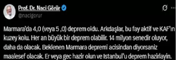 Ünlü jeoloji profesörü Naci Görür, Marmara Denizi'nde meydana gelen ve vatandaşlarda korkuya neden olan 5 büyüklüğündeki depreme ilişkin, "Bu fay aktif ve KAF'ın kuzey kolu. Her an büyük deprem olabilir. Beklenen Marmara depremi açısından diyorsanız maalesef olacak. Er veya geç. Hazır olun ve İstanbul'u depreme hazırlayın" dedi.