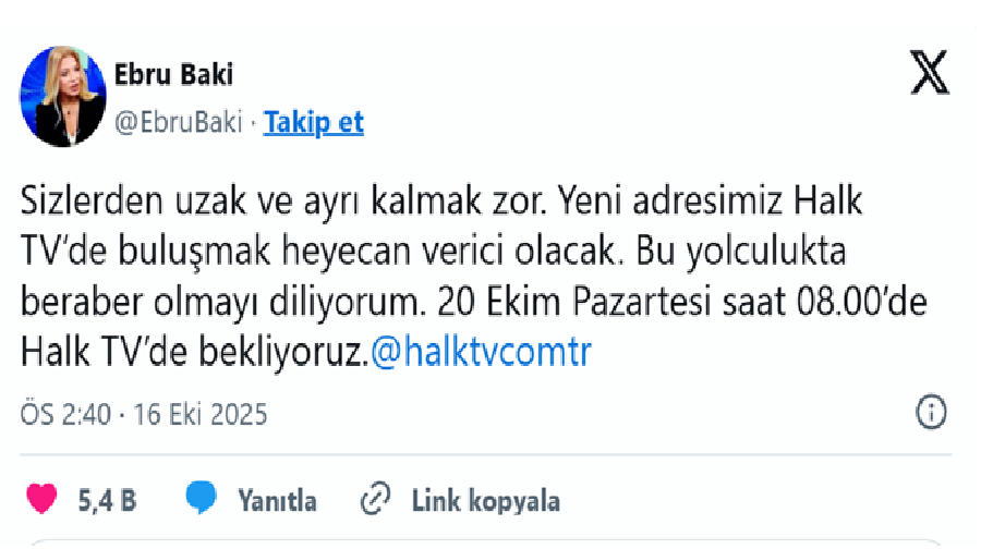 Baki, “Sizlerden uzak ve ayrı kalmak zor. Yeni adresimiz Halk TV’de buluşmak heyecan verici olacak. Bu yolculukta beraber olmayı diliyorum. 20 Ekim Pazartesi saat 08.00’de Halk TV’de bekliyoruz” diye yazdı.